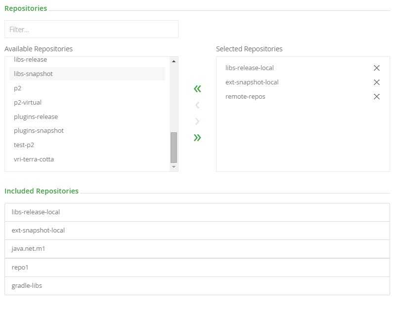 The Included Repositories section displays the effective list of actual repositories included in this virtual repository. If any of the available repositories you have selected are themselves virtual repositories, then the Included Repositories section will display the local and remote repositories included within them. The Included Repository list is automatically updated in case any of the nested virtual repositories change.