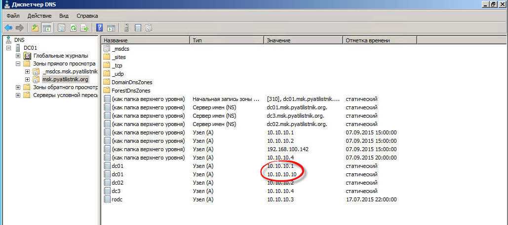 Посмотрим нашу DNS зоны и видим, что в ней у dc01 два ip адреса.