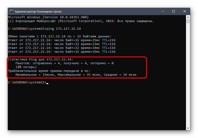 По завершении отобразится несколько строк, показывающих статистику проверенных пакетов. Исходя из полученных результатов, можно делать выводы о доступности указанного адреса и стабильности соединения с интернетом.