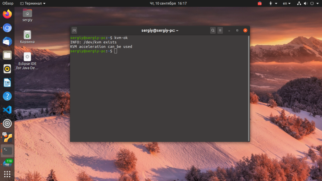 После выполнения этой команды выйдите из системы и войдите снова. Далее, давайте проверим все ли правильно было установлено. Для этого используйте команду kvm-ok:
