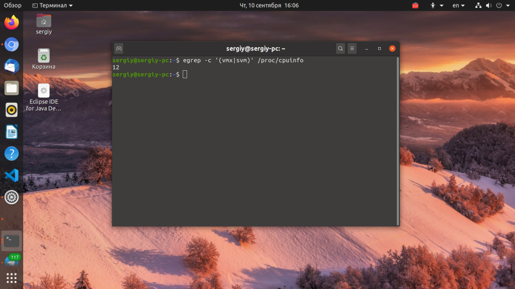 Если в результате будет возвращено 0 — значит ваш процессор не поддерживает аппаратной виртуализации, если 1 или больше — то вы можете использовать KVM на своей машине.