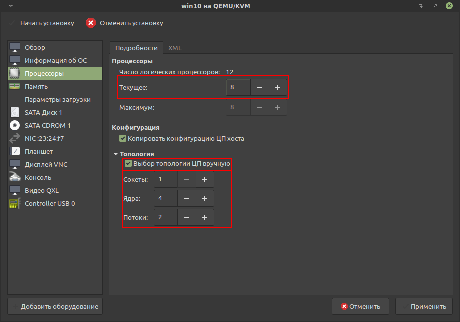 В этой вкладке указывается число потоков, конфигурация (модель процессора) и топология процессора. В данном примере копируется конфигурация хоста с разделением на 8 потоков: 4 ядра умножаются на 2 потока, что имитирует гиперпоточность.