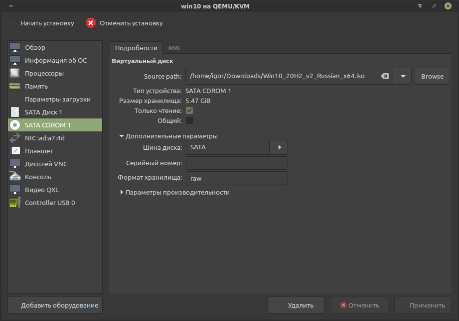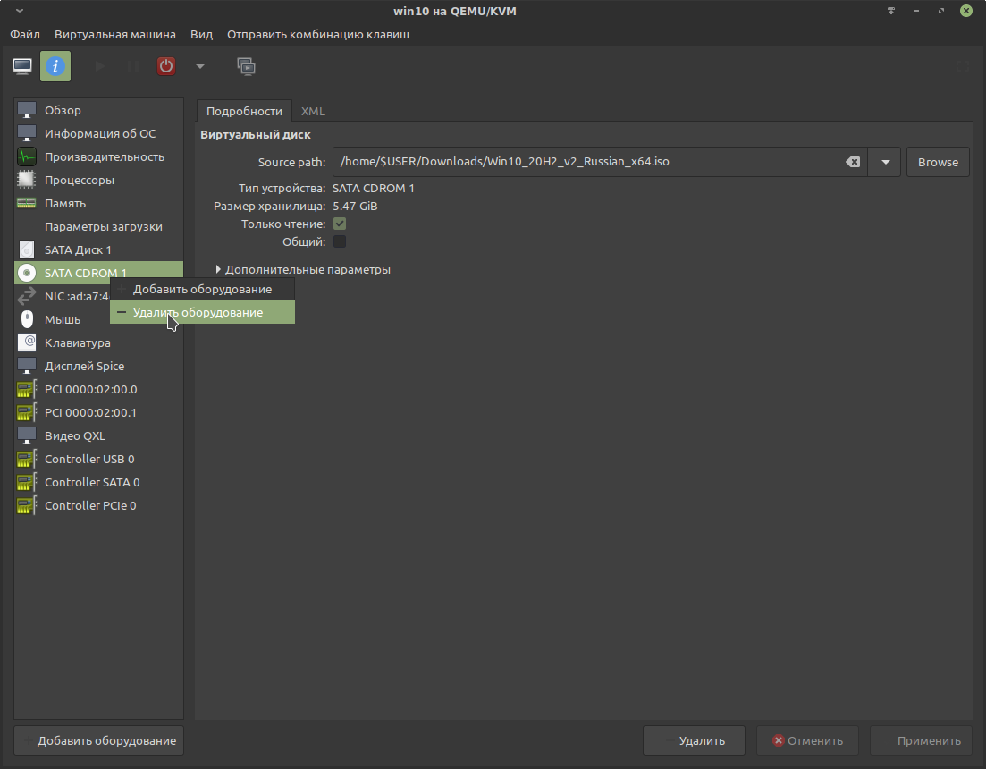 После установки и завершения работы виртуальной машины можно удалить SATA CDROM 1: