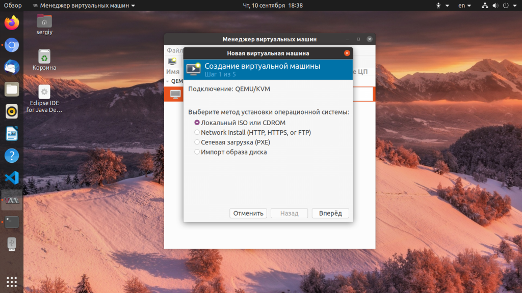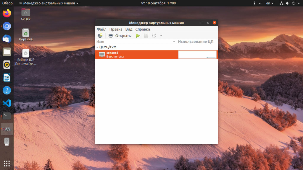 Запустим Менеджер виртуальных машин (virt-manager) из меню используемой графической среды.