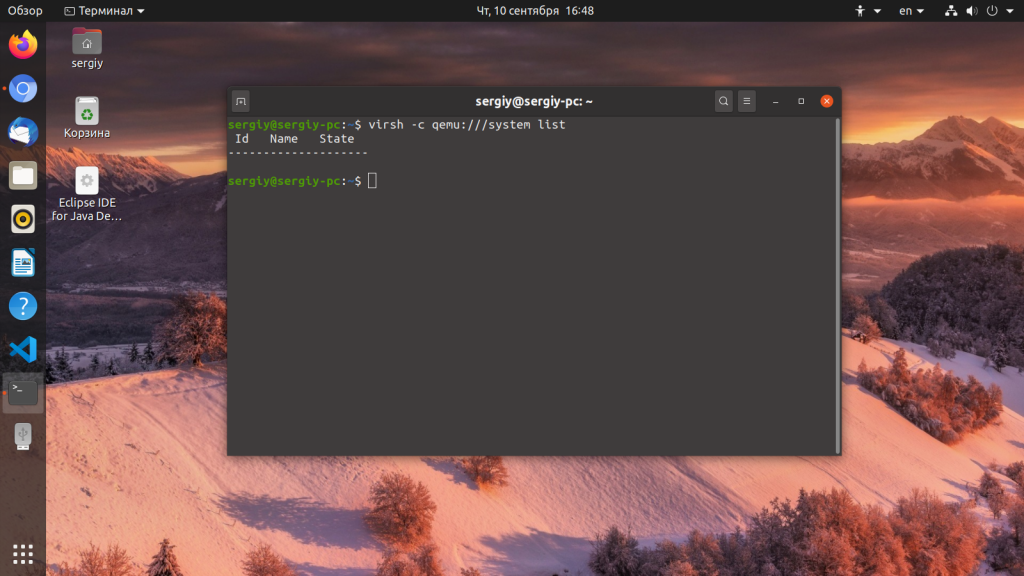 Настройка KVM Ubuntu завершена и теперь мы можем перейти к ее использованию. Сначала давайте просмотрим список уже существующих виртуальных машин: