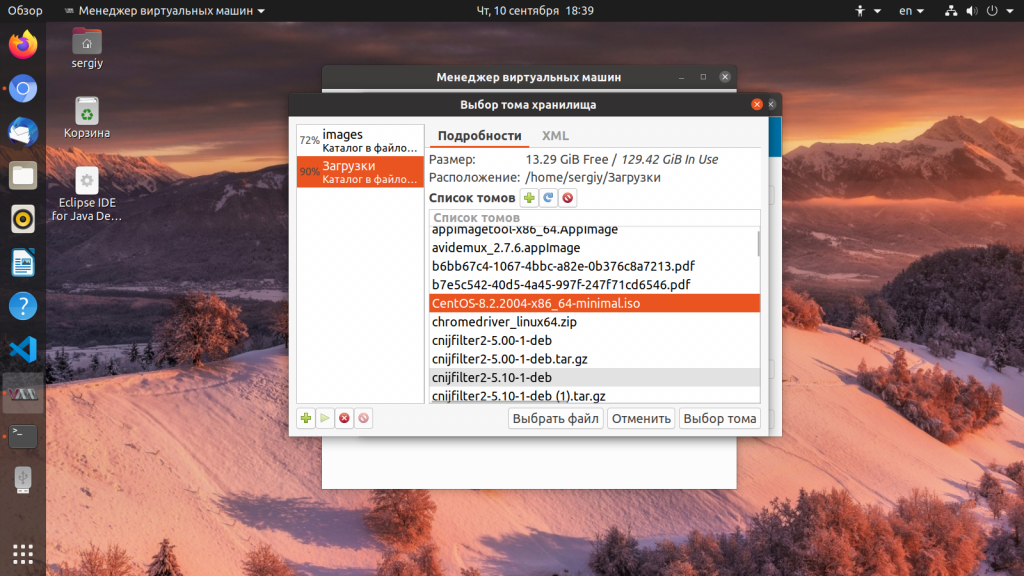 По умолчанию предлагается использовать каталог ~/.local/share/libvirt/images для хранения дисковых образов виртуальных машин, однако для удобства мы создадим новые.