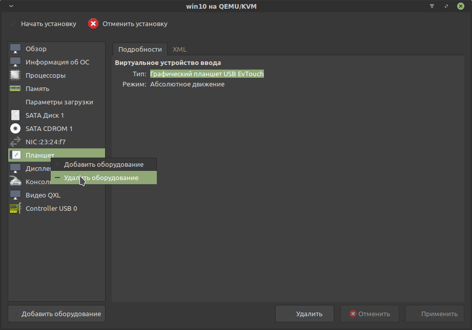 В главном окне менеджера виртуальных машин, нажмём правой кнопкой мыши по QEMU/KVM, затем в контекстном меню выберем вариант Отключиться и Удалить. Подтвердим удаление.