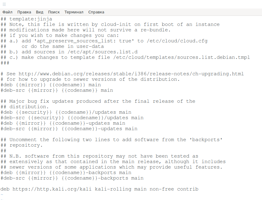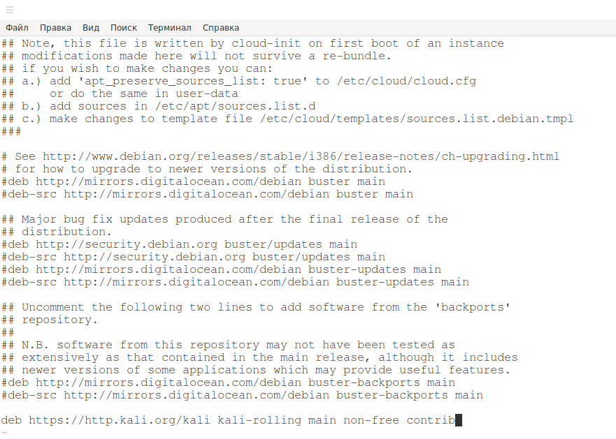 В нём также комментируем ненужные строки и добавляем строку с репозиториями Kali Linux. В результате у меня получилось так: