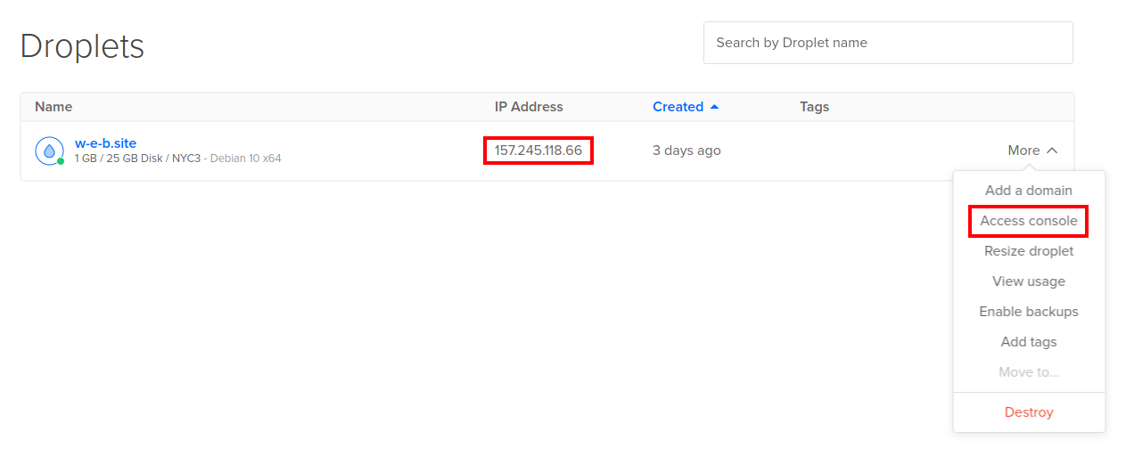 Довольно быстро будет создана новая система. IP адрес ей будет присвоен автоматически, вы найдёте в информации о дроплете. Для подключения и управления удобнее всего использовать SSH, поэтому смотрите «Полное руководство по SSH в Linux и Windows».