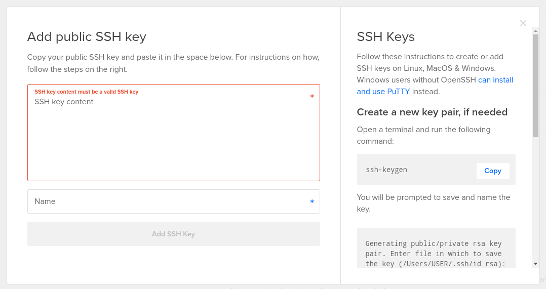 Теперь нужно указать публичный ключ SSH. Если у вас его нет, то вам нужно сгенерировать пару публичный-приватный ключ. В Linux это делается командой: