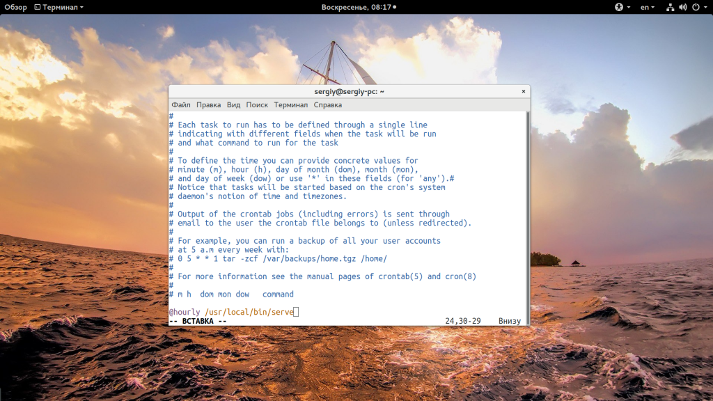 # crontab -e SHELL=binbash MAILTO=mymail@someprovider.com PATH=bin:sbin:usrbin:usrsbin:usrlocalbin:usrlocalsbin # Детали смотрите в следующих разделах # Примеры оформления задач в планировщике (формат данных): # .---------------- минуты (0 - 59) # | .------------- часы (0 - 23) # | | .---------- дни месяца (1 - 31) # | | | .------- сами месяцы (1 - 12) OR jan,feb,mar,apr ... # | | | | .---- дни недели (0 - 6) (0 или 7 это воскресенье в зависимости от настроек системы) можно использовать сокращения типа mon,tue,wed,thu,fri,sat,sun # | | | | | # * * * * * имя пользоваться команда, которую нужно запустить # создание копии всей операционной системы с помощью кастомного скрипта 01 01 ***usrlocalbin/bckp-vbd1 ; usrlocalbin/bckp-vbd2 # установка соответствия между временем операционной системы и "железа" 03 05 ***sbinhwclock --systohc # проведение обновления операционной системы в заданный период времени 25 04 1 * * /usr/bin/apt-get update