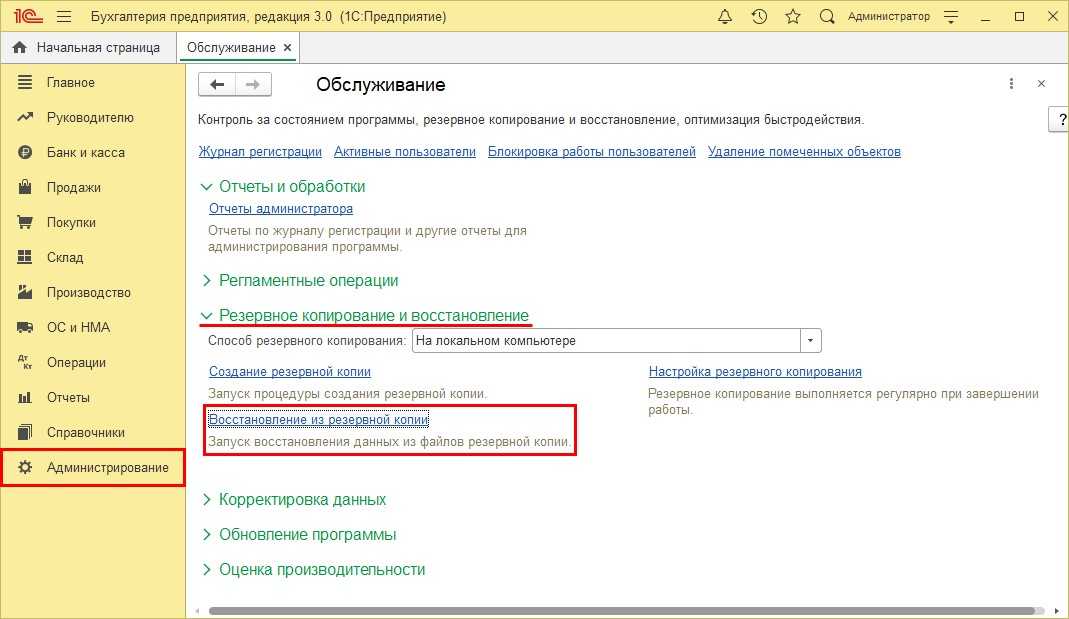 Действие 1. Также перейдите в раздел «Администрирование», затем в «Обслуживание». Далее нужно открыть «Резервное копирование и восстановление» и запустить ссылку «Восстановление из резервной копии».