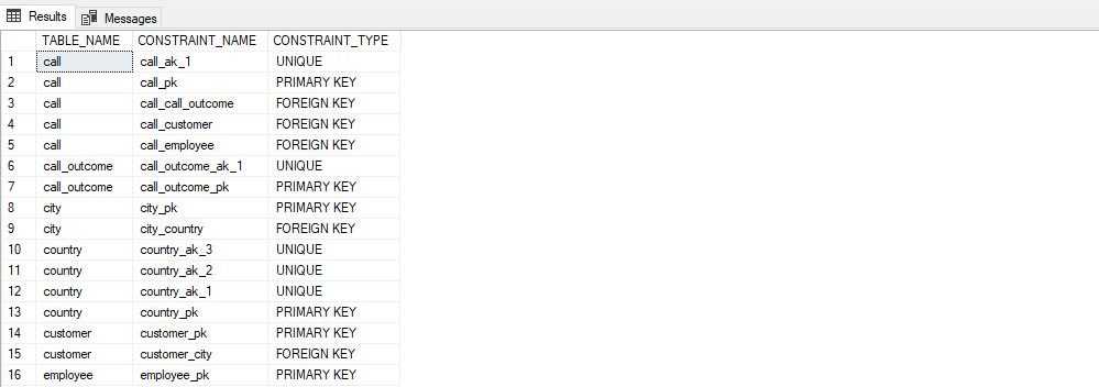 Since this database is an ANSI standard, the following queries should work in other DBMS systems as well. We’ll list all tables in the database we’ve selected and also all constraints. To do that, we’ll use the following queries: