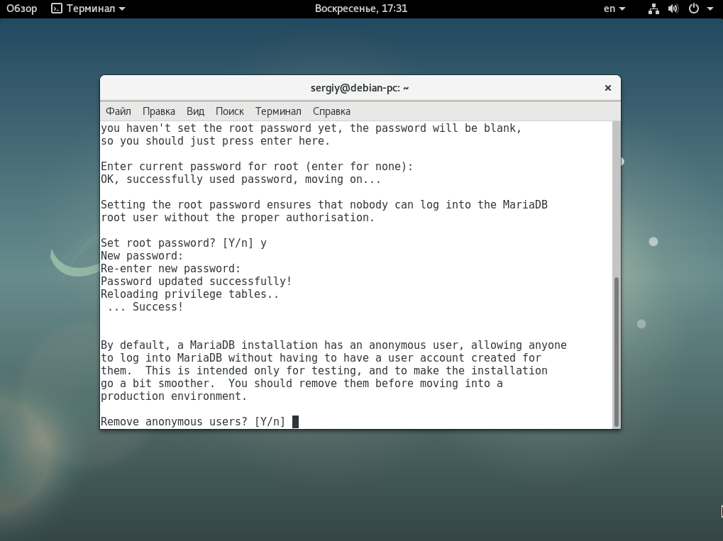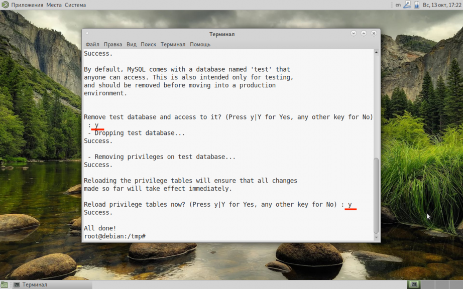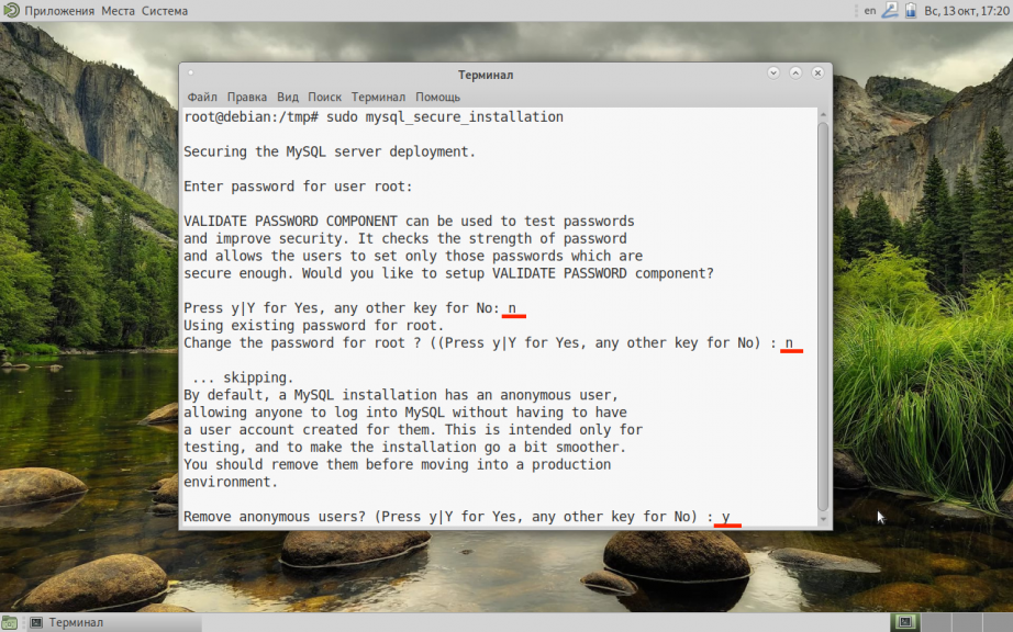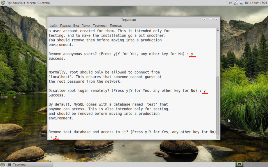 Когда сценарий предложит вам установить новый пароль для пользователя root выберите No (вы уже установили его во время установки пакета). Затем внимательно следуйте другим подсказкам и выберите y (для YES), чтобы удалить анонимных пользователей, запретить удаленный вход под root в систему, удалить тестовую базу данных и перезагрузить таблицу привилегий.