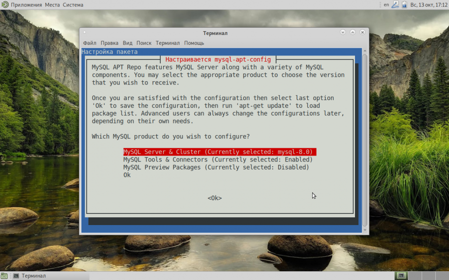 Во время установки пакета вам будет предложено настроить репозиторий MySQL APT для выбора версий сервера MySQL и других компонентов, которые вы хотите установить. Для установки последней версии оставьте все как есть, перейдите к Оk и нажмите Enter.