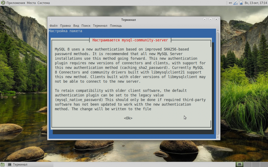 После этого вас предупредят о новой системе аутентификации, на основе SHA256, использующейся в MySQL, нажмите Ok. Выберите плагин аутентификации (оставьте опцию по умолчанию, чтобы использовать рекомендуемый плагин) и нажмите кнопку Enter, чтобы завершить процесс установки.