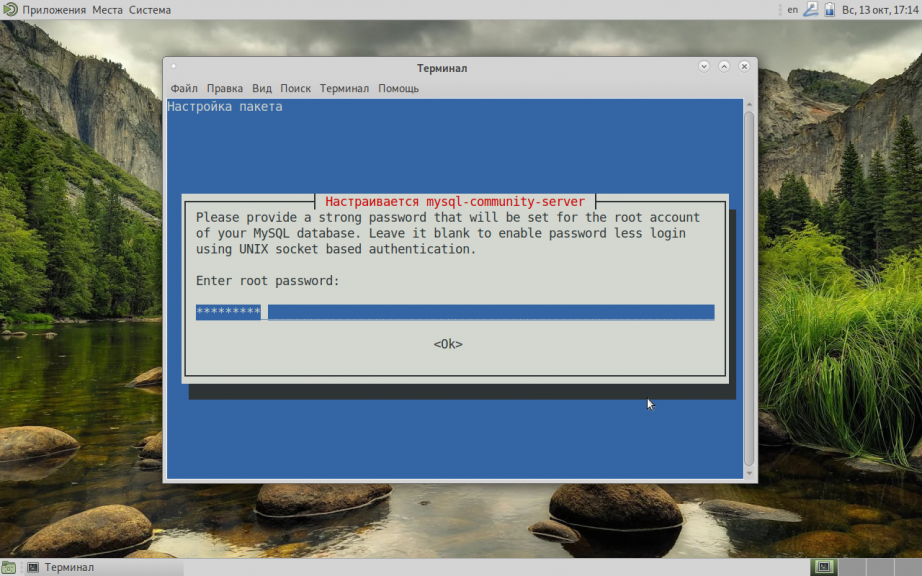 Во время установки появится диалоговое окно конфигурации, в котором нужно будет установить пароль пользователя root для MySQL. Введите безопасный и надежный пароль, а затем подтвердите его.