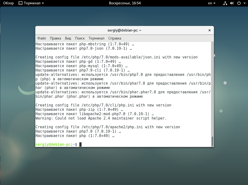 Мы установили не только веб-сервер, но и основные библиотеки PHP, которые могут понадобиться для работы с графикой, строками и сжатыми архивами. Пакет libapache2-php отвечает за интеграцию поддержки php для веб-сервера Apache.