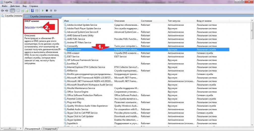 Далее в открывшемся списке находим и кликаем пункт «Службы», дабы появилось окошко соответствующего сервиса. После того как оно открылось, ищем в нем ищем службу DHCP-клиент и запускаем ее нажатием соответствующей кнопки в меню слева: