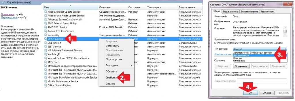 Следующий шаг – проверяем тип запуска службы. В идеале запускаться она должна автоматически. Если это не так, кликаем правой кнопкой мышки по пункту DHCP-клиент, выбираем в появившемся меню вкладку «Свойства», выставляем автоматический тип запуска и сохраняем настройки нажатием кнопки OK: