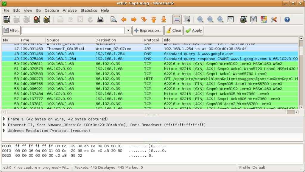 После того, как вы захватили данные своей сети, вы захотите посмотреть на свои захваченные пакеты. На скриншоте ниже вы увидите три панели, список пакетов панель, байты пакета панель и детали пакета панель.