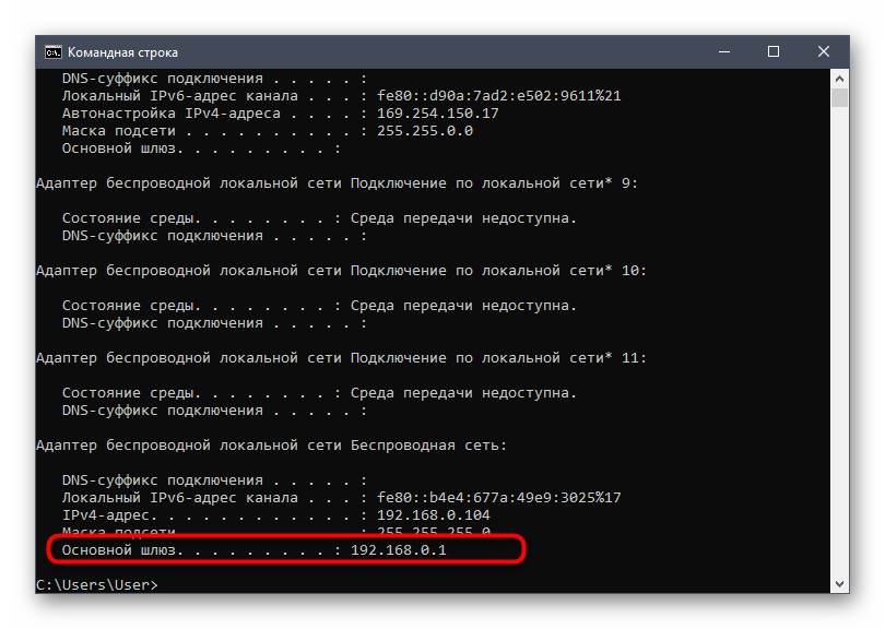 Через несколько секунд на экране появится общая карта сети, где нужно найти основной шлюз. Это IP-адрес роутера, который мы и будет использовать для получения MAC в дальнейшем. Есть и другие возможные варианты определения этого IP. Детальнее о них читайте далее. Подробнее: Определение IP-адреса роутера