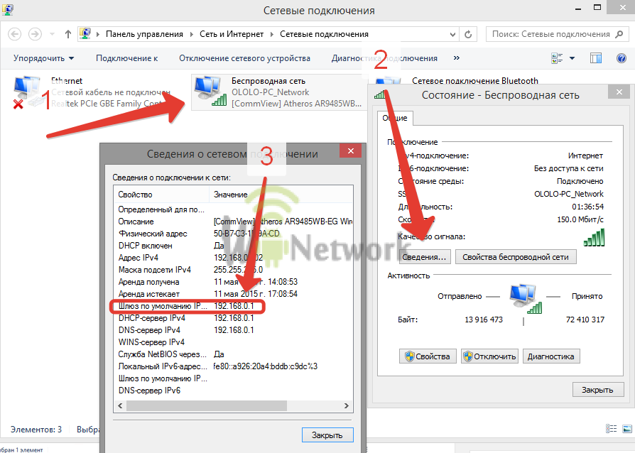 - Нажимаем на него двойным кликом. Появится окно состояния, в нем жмем на кнопку «Сведения…». Справа от надписи «Шлюз по умолчанию IPv4» будет написан адрес роутера, чаще всего это 192.168.0.1 или 192.168.1.1.