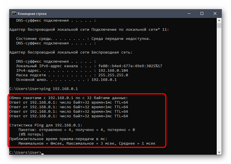 Эта команда отвечает за проверку обмена информации между устройствами. Если ответы пришли быстро и потерь не обнаружено, переходите далее.