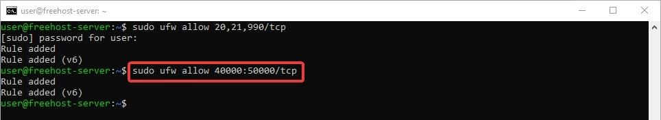Затем откроем порты 40000-50000 это диапазон пассивных портов для FTP, которые мы потом укажем в конфигурационном файле vsftpd: