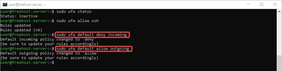 sudo ufw default deny incoming sudo ufw default allow outgoing