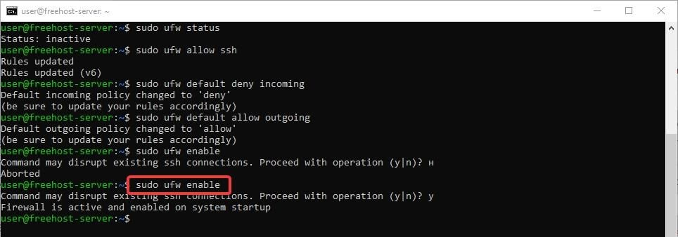 Ну и напоследок, активируем сам брандмауэр ufw, для этого необходимо ввести команду: