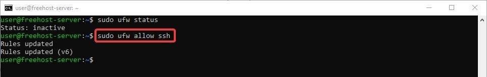 Первым правилом необходимо разрешить подключения к нашему серверу по протоколу SSH, иначе после активации брандмауэра мы потеряем возможность подключаться к серверу. Чтобы настроить сервер на разрешение входящих SSH-соединений, введите команду:
