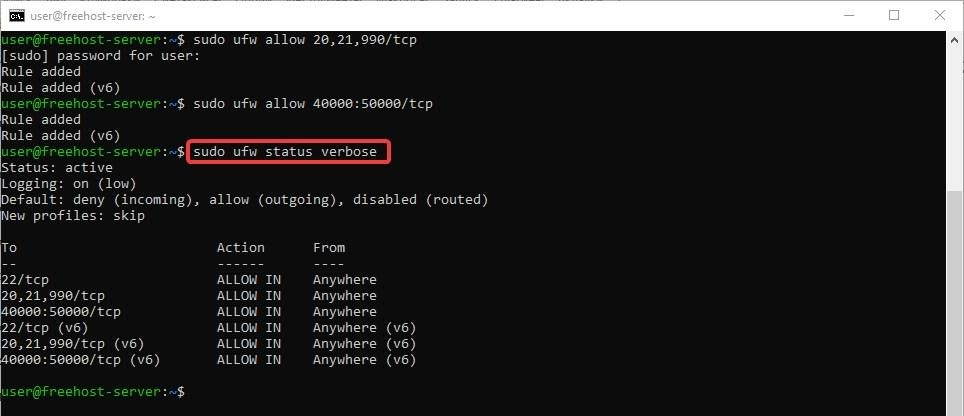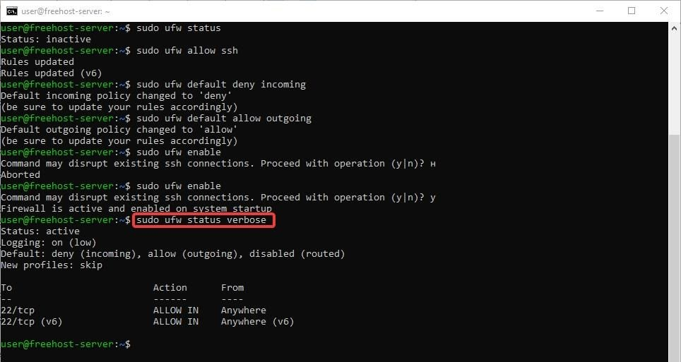 Теперь брандмауэр активен. Выполните команду sudo ufw status verbose, чтобы увидеть активные правила брандмауэра.