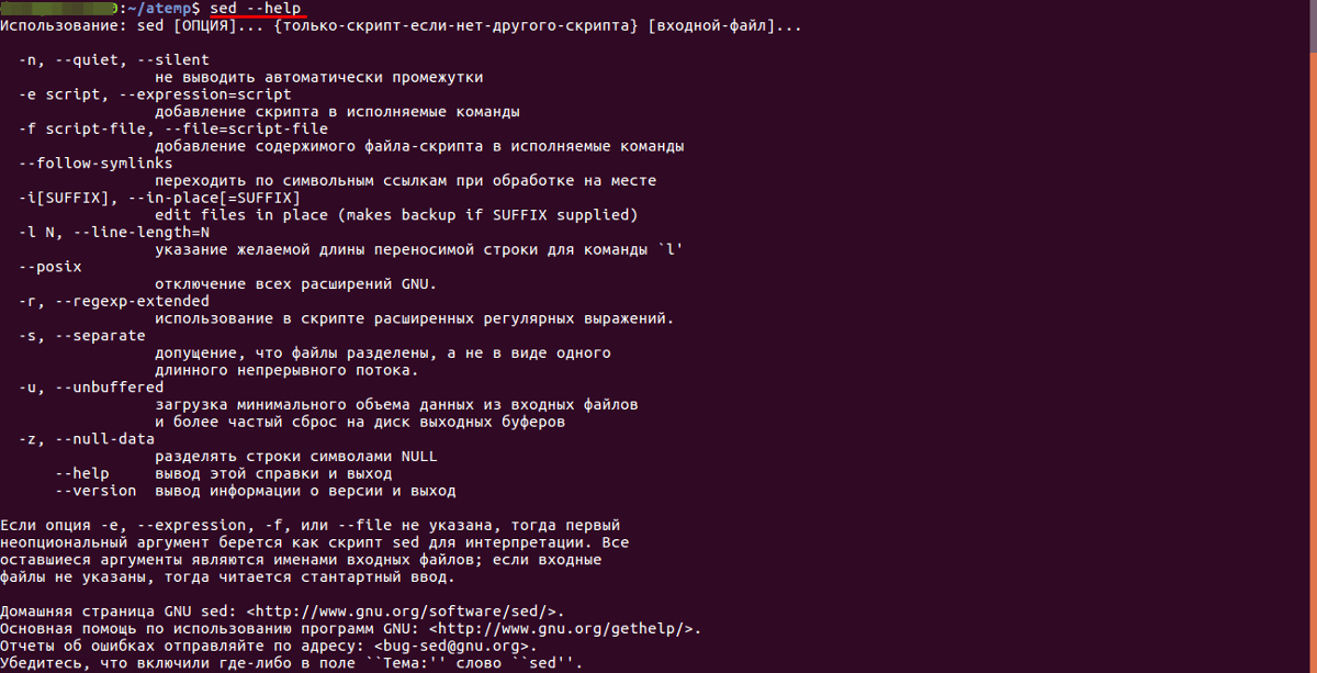 sed instructions (где options— ключи-опции для указания метода обработки текста, instructions— команда, совершаемая над найденным фрагментом текста, file_name— имя файла, над которым совершаются действия).