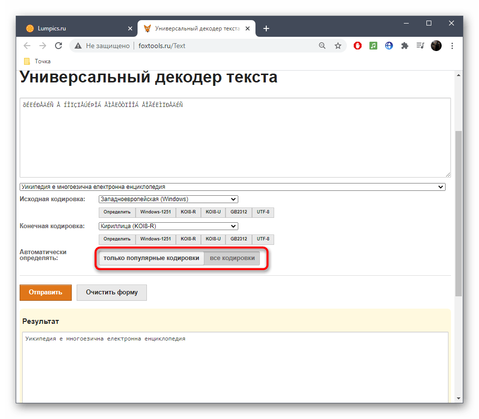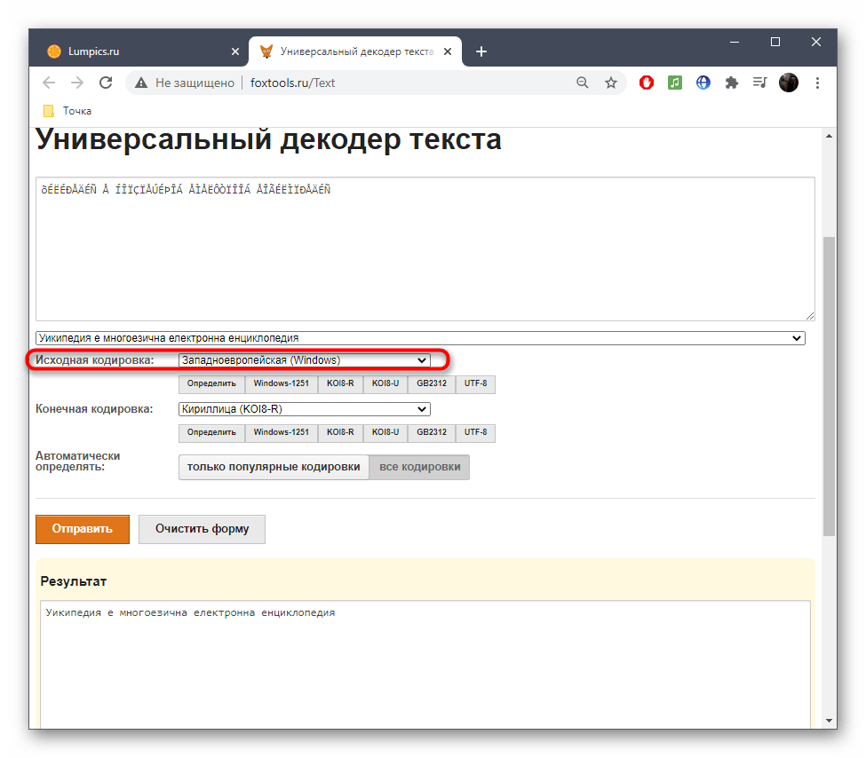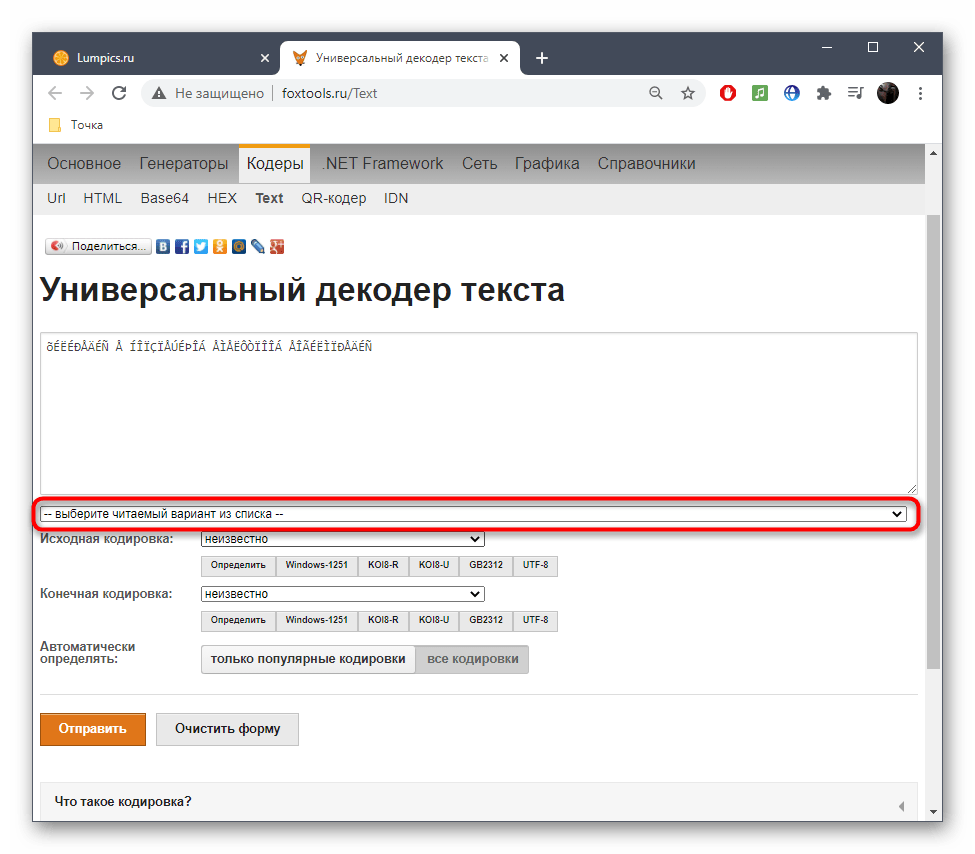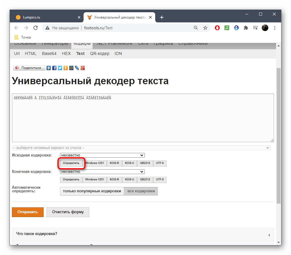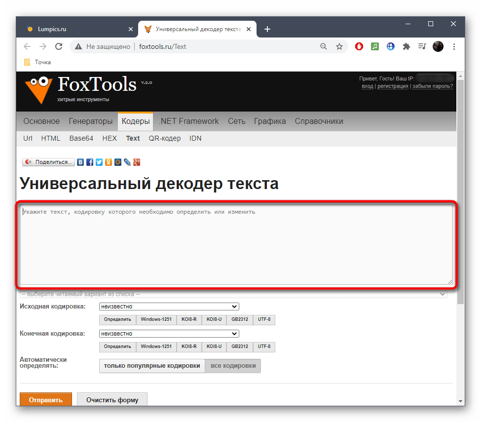 FoxTools — еще один онлайн-сервис, основное предназначение которого заключается в декодировании текста, однако его функциональность можно использовать и для определения необходимого символьного набора, что происходит так: