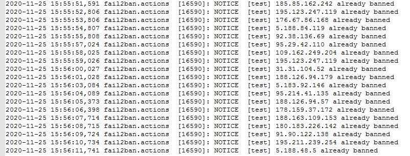 ВАЖНО: — но если лог test.log появится потом = то его уже fail2ban не будет обрабатывать. смотрим в логах /var/log/fail2ban.log