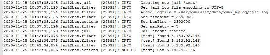 enabled = true filter = testfilter logpath = /var/www/user/data/www/_mylog/test.log # 30 days bantime = 2592000 findtime = 2592000 maxretry = 3