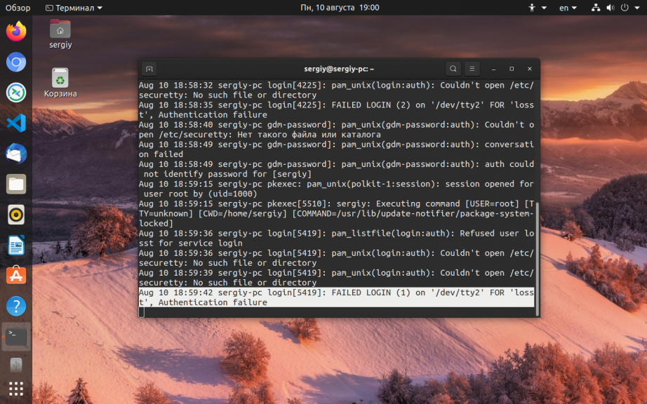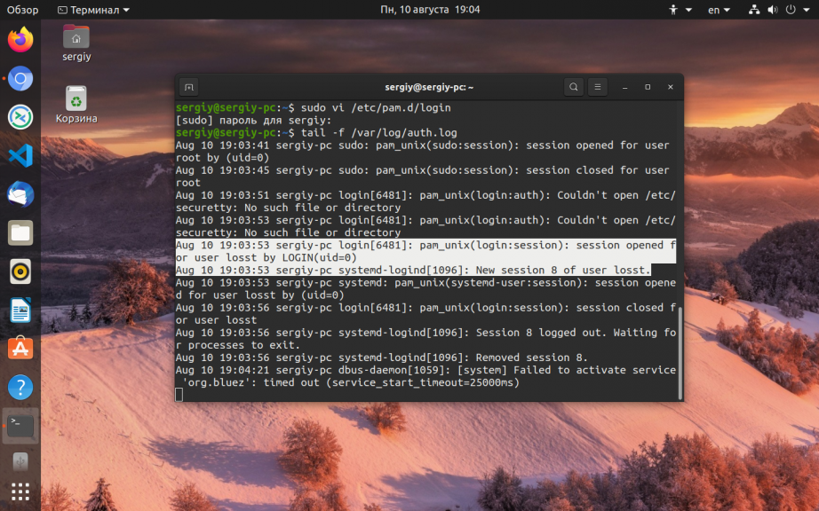 Теперь в файл /etc/denyusers добавьте имя пользователя losst, естественно, такой пользователь должен существовать в системе. Затем попробуйте перейти в любую консоль и авторизоваться от его имени. У вас ничего не выйдет, а в логе /var/log/security или /var/log/auth.log будет сообщение об ошибке: