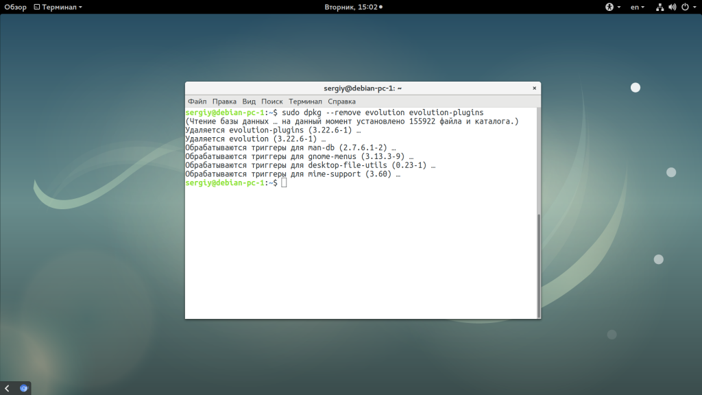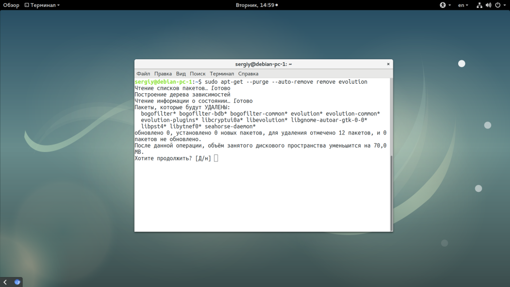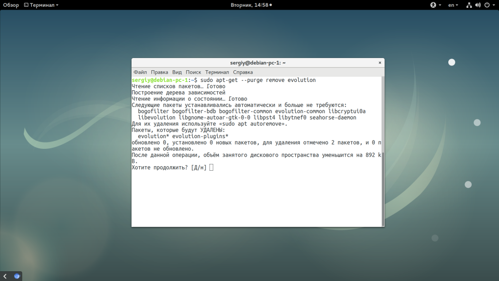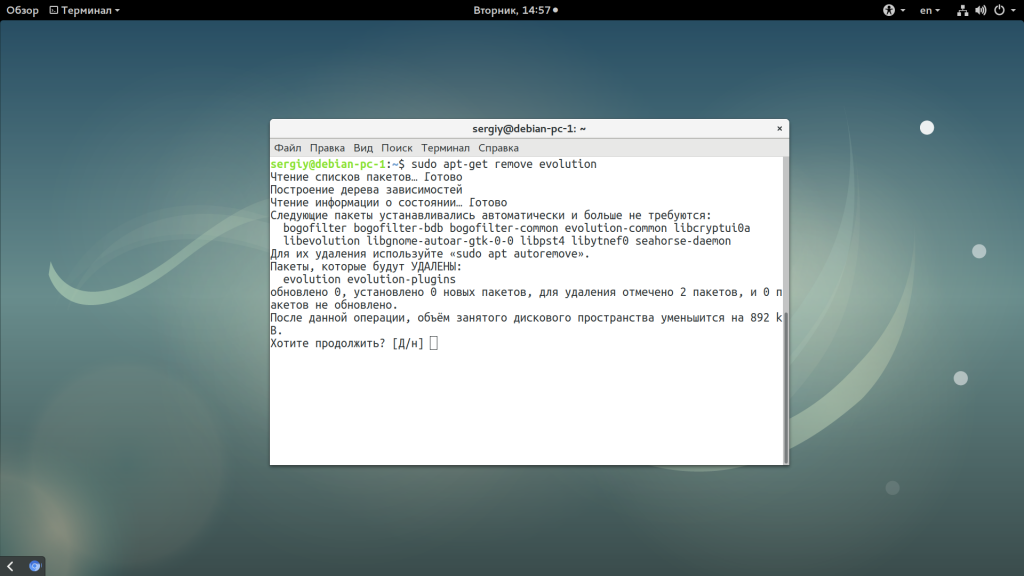 Например, удалим установленный по умолчанию почтовый клиент evolution. Если бы мы использовали звездочку, то были бы удаленны все пакеты, имя которых начинается на evolution, например, evolution-data и evolution-plugins.