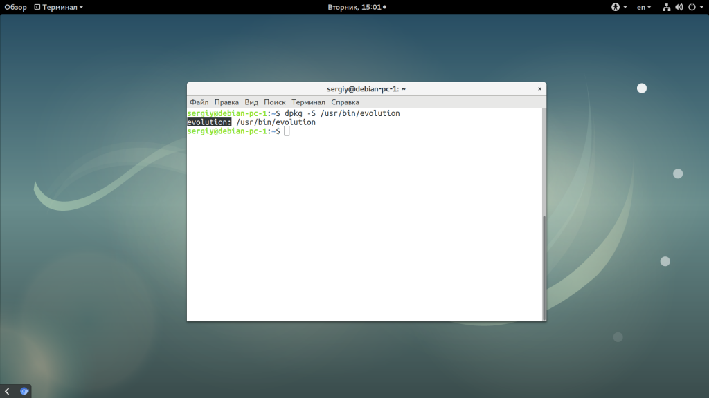 Последняя команда выполняет полное удаление пакета из системы. Но чтобы удалить пакет вам нужно сначала знать его имя. Имя пакета можно узнать с помощью утилиты dpkg. Сначала ищем какие-либо файлы программы по ее названию, например, тот же evolution: