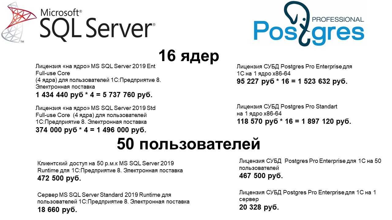 Но я бы более корректно сравнил Postgres Pro Enterprise с MS SQL Standard. По набору функциональности MS SQL Standard аналогичен Postgres Pro Enterprise. Умеет делать такие же репликации, не имеет ограничений на ядра и на память… Если сравнивать так – цена почти одинаковая, 1,5 млн.