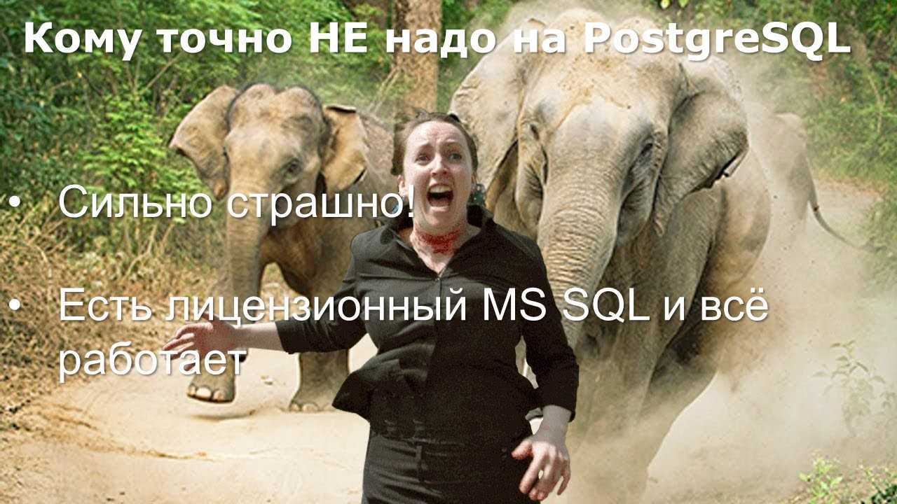 В моем понимании вот такая картинка символизирует мысли тех, кто находится на перепутье: идти ли на Postgres. Кажется, что с MS SQL все понятно, есть только маленькая кучка проблем, но мы знаем, как их решать. При этом с Postgres – кошмар, мы это никогда не разгребем.