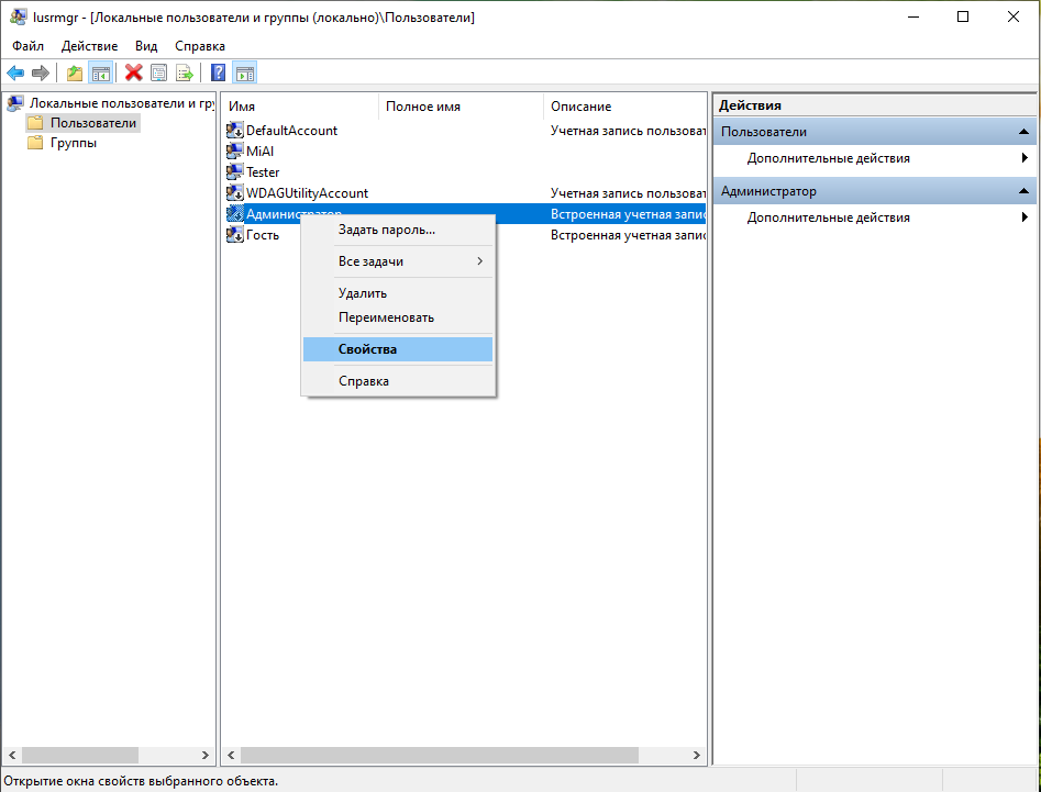 4. Щёлкните правой кнопкой мыши Администратор и выберите Свойства.