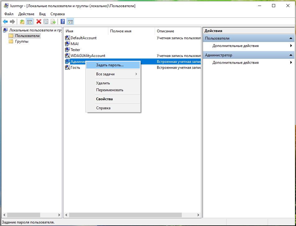 6. Снова щёлкните правой кнопкой мыши учётную запись администратора и выберите «Задать пароль».