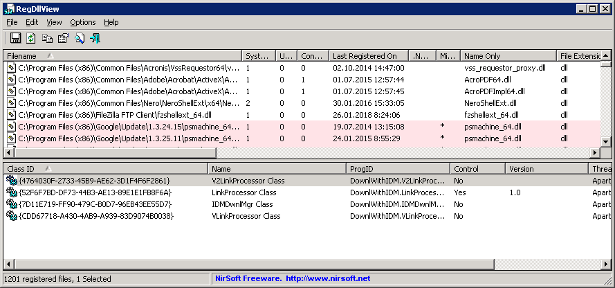 В качестве дополнительного программного средства для управления регистрацией объектов COM, очень удобно пользоваться бесплатной утилитой от Nirsoft RegDLLView.exe. Программа не требует установки в системе, имеет небольшой размер и позволяет: