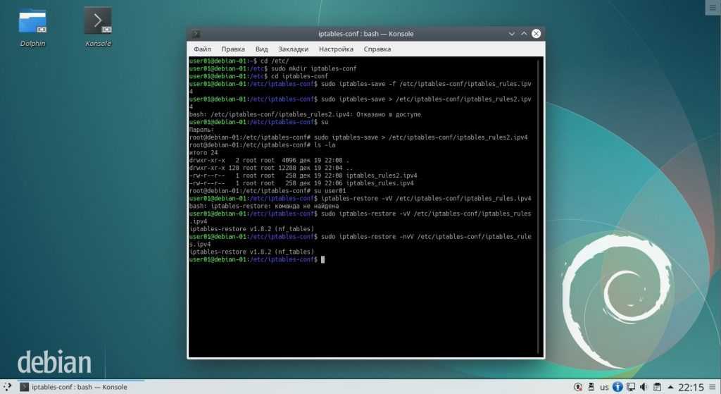 После установки в каталоге /etc/iptables появятся файлы rules.v4 и rules.v6. В эти файлы будут записываться правила межсетевого экрана.