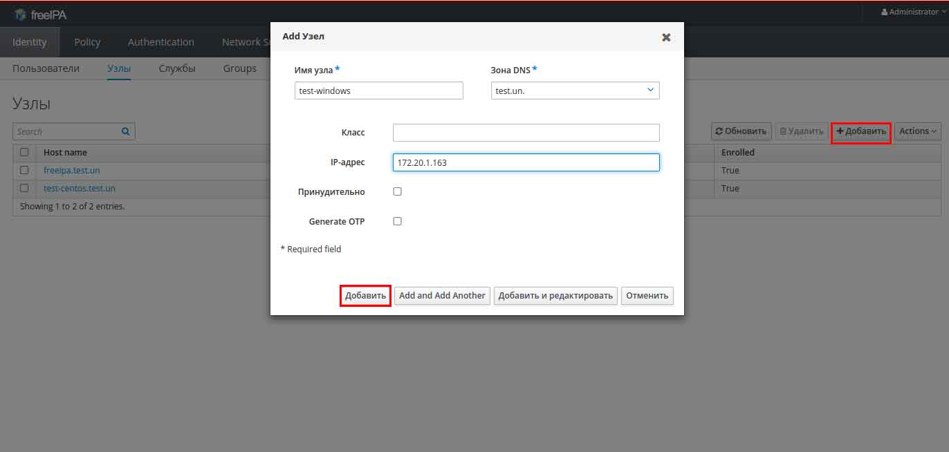 С помощью веб-интерфейса Freeipa созданим новый узел в домене