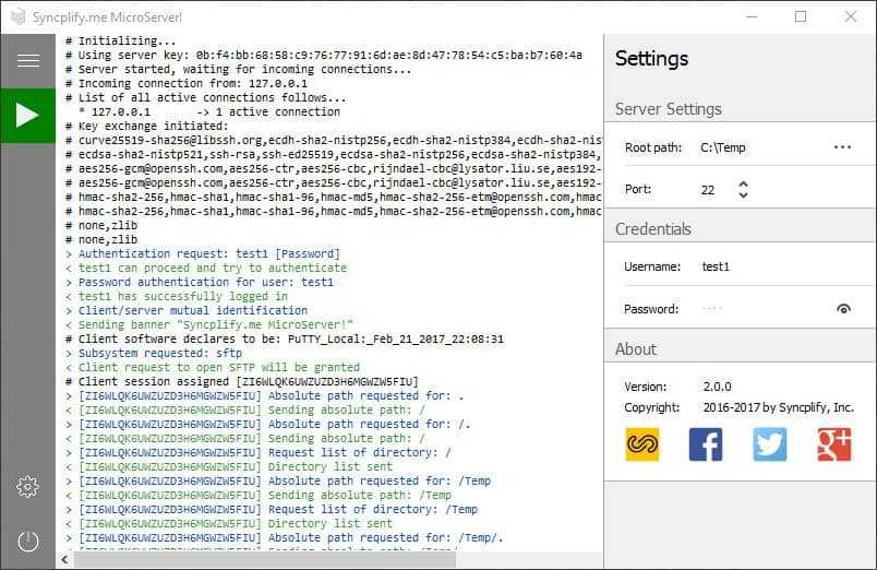В дополнение к бесплатной пробной версии Syncplify также предлагает сервер Micro SFTP для Windows. Это полностью автономный портативный SFTP-сервер, который можно запустить с USB-накопителя. В отличие от бесплатной ознакомительной версии полноценного SFTP-сервера Syncplify, версия Micro-сервера полностью бесплатна для использования в любых ситуациях, включая производственное и коммерческое использование. Вам нужно будет перейти на платную услугу, если вы хотите удаленный доступ к каталогу файлов через SSH.