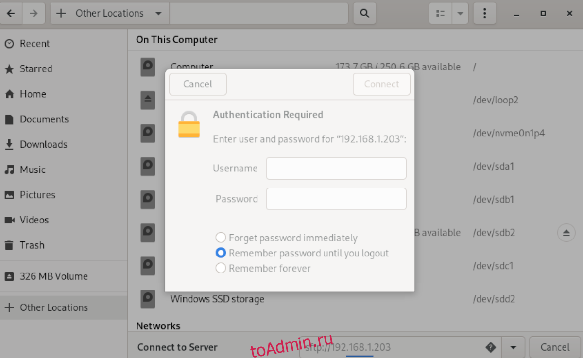 Внутри «Другие места» найдите текстовое поле «Подключиться к серверу» и щелкните его мышью. Затем введите адрес сервера. Например: