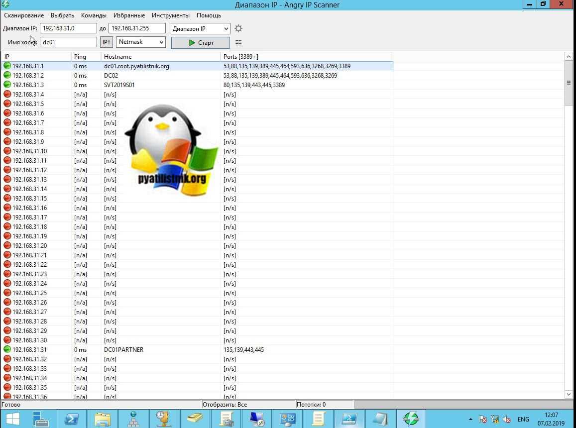 Открываю свой порт-сканер и натравливаю его на свой свежеустановленный домен на Windows Server 2019 (/install-active-directory-windows-server-2019/). По результатам я вижу два контроллера домена dc01.root.pyatilistnik.org и dc02.root.pyatilistnik.org. Справа от них в соответствующем поле я вижу полный список портов, используемых Active Directory. Давайте подробнее остановимся на каждом из них.